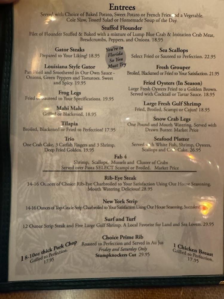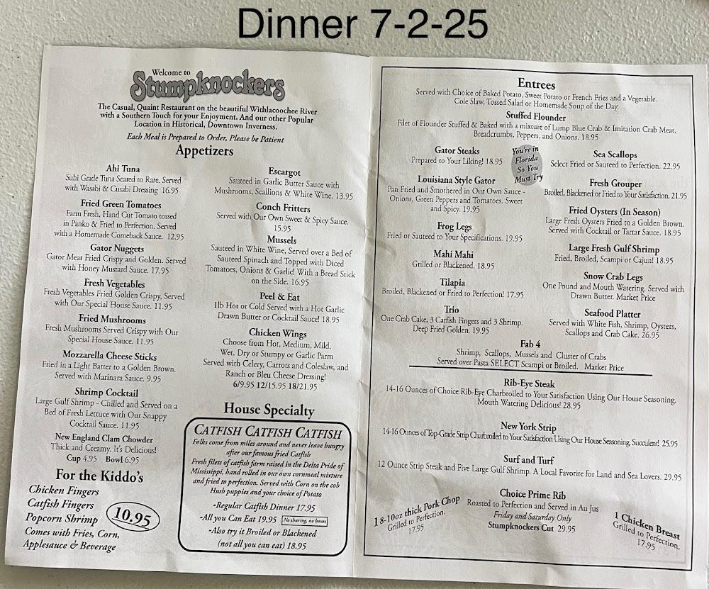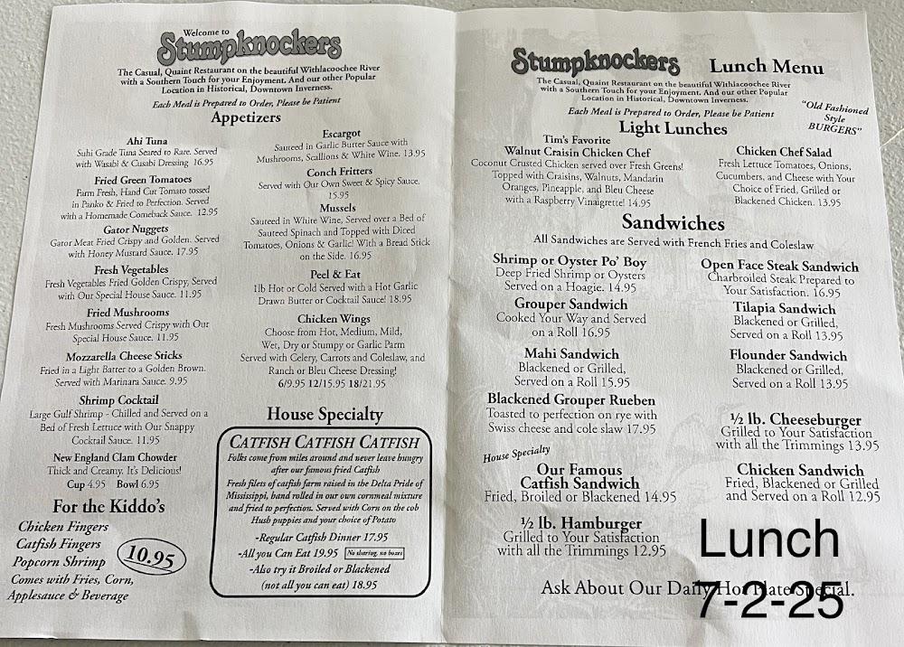 Stumpknockers Restaurants embodies the spirit of community and the rich flavors of local seafood. Nestled in the charming town of Inverness, this eatery has become a beloved destination for families and food lovers alike. The warm, friendly atmosphere welcomes guests of all demographics, from tourists eager for a taste of Old Florida to locals looking for a comforting meal. Families can dine without worry, as the establishment offers wheelchair-accessible seating, high chairs, and a children's menu. Outdoor seating allows for a pleasant dining experience amidst the Florida sunshine, while a full bar stocked with an excellent variety of beers and cocktails draws in those looking to unwind. The exterior, characterized by a historic vibe, invites curiosity as you step inside and discover a cozy interior brimming with personality. A visit to Stumpknockers isn't just a meal but a true taste of the area's culture.